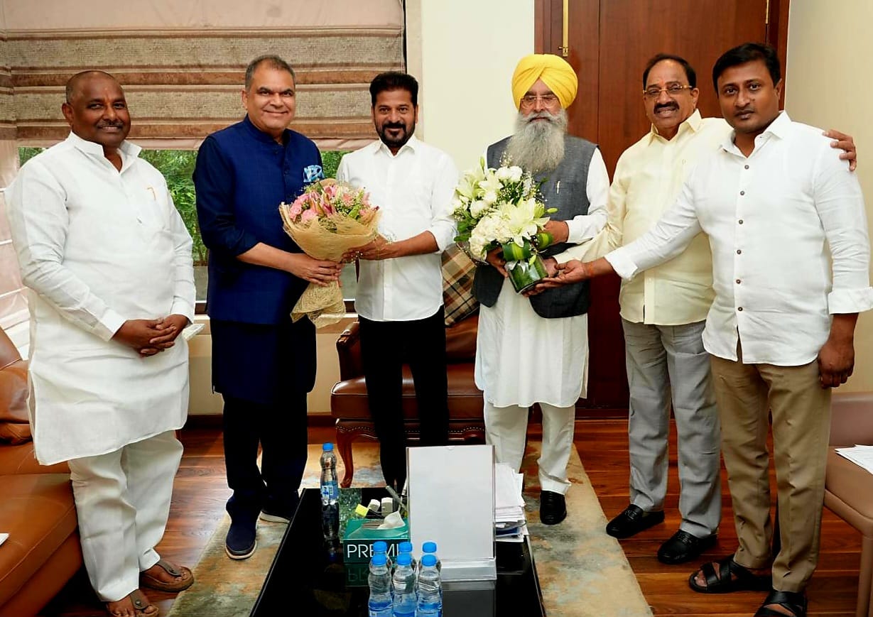 Punjab E News (Pawan Dhupar): In a significant diplomatic engagement, Cabinet Ministers Sanjeev Arora and Gurmeet Singh Khudian paid a courtesy visit to Chief Minister Revanth Reddy of Telangana. During the meeting, the ministers formally extended an invitation to the Chief Minister to participate in the upcoming commemorative events marking the 350th martyrdom anniversary of Guru Tegh Bahadur Ji, organized by the Government of Punjab.