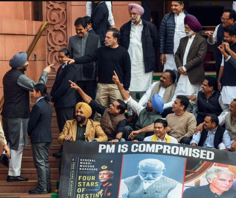 New Delhi: Congress MPs on Wednesday staged a protest against Prime Minister Narendra Modi, accusing him of being “compromised”, leading to a sharp verbal exchange between Leader of the Opposition Rahul Gandhi and Union minister Ravneet Singh Bittu.