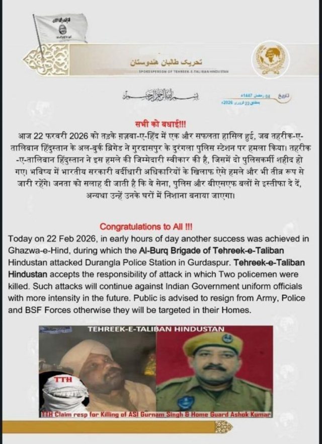Gurdaspur: Posters allegedly released by a group calling itself Tehreek-e-Taliban Hindustan (TTH) surfaced on social media Sunday evening, claiming responsibility for the killing of two police personnel at the Dorangla police post near the India-Pakistan international border in Gurdaspur district.