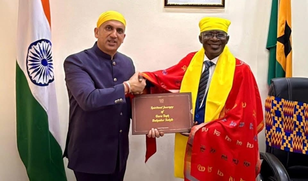 New Delhi : In a significant gesture aimed at fostering cultural and religious heritage ties with Ghana, State Information Commissioner, Punjab, Harpreet Sandhu, had an innovative meeting with newly appointed High Commissioner of Ghana to India H.E. Prof. Kwasi Obiri-Danso at the Ghana High Commission, New Delhi wherein book dedicated to 350th Martyrdom Year of Sri Guru Tegh Bahadur Sahib was presented to the High Commissioner of Ghana to India H.E. Mr. Kwasi Obiri-Danso along with set of pious visual literature showcasing the historic shrines having relevance with Ninth Sikh Guru, a traditional stole adorned with Punjabi alphabets, Sikh symbolic heritage Sword signifying Punjab’s rich culture as a step to promote global cultural ties between Ghana and Punjab by State Information Commissioner, Punjab Harpreet Sandhu.