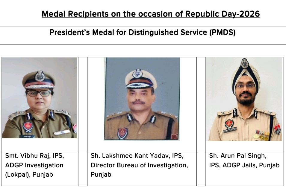 Additional Director General of Police (ADGP) Investigation (Lokpal) Punjab Vibhu Raj, Director Bureau of Investigation (BOI) Punjab LK Yadav and ADGP Jails Arun Pal Singh to be conferred with President’s Medal for Distinguished Service.