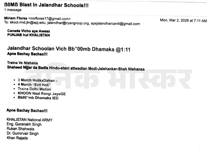 जालंधर के 2 स्कूलों को बम से उड़ाने की धमकी भरी मेल मिली है।