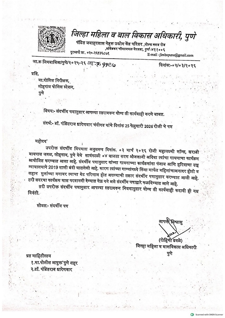 दिल्ली में धमाकेदार शो बाद पंजाबी सिंगर करण औजला के पी पॉप कल्चर इंडिया टूर 2026′ के तहत आज पुणे महालक्ष्मी लॉन्स, खराड़ी में कांसर्ट है। लेकिन उससे पहले नया विवाद खड़ा हो गया। चंडीगढ़ के प्रोफेसर धरनेवर के वहां भी शिकायत करने के बाद महिला-बाल विकास अधिकारी रोहिणी उबाले ने संबंधी पुलिस स्टेशन को आर्डर जारी किए है।