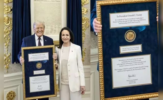 अमेरिका के राष्ट्रपति डोनाल्ड ट्रंप को Venezuela की विपक्षी नेता मारिया कोरीना माचाडो ने नोबेल शांति पुरस्कार का मेडल सौंपा है। यह मुलाकात व्हाइट हाउस में हुई, जहां माचाडो ने खुद ट्रंप को यह मेडल दिया। इस कदम को माचाडो की एक बड़ी राजनीतिक रणनीति माना जा रहा है, क्योंकि हाल ही में ट्रंप ने वेनेजुएला की राजनीति में उनका खुलकर समर्थन नहीं किया था।